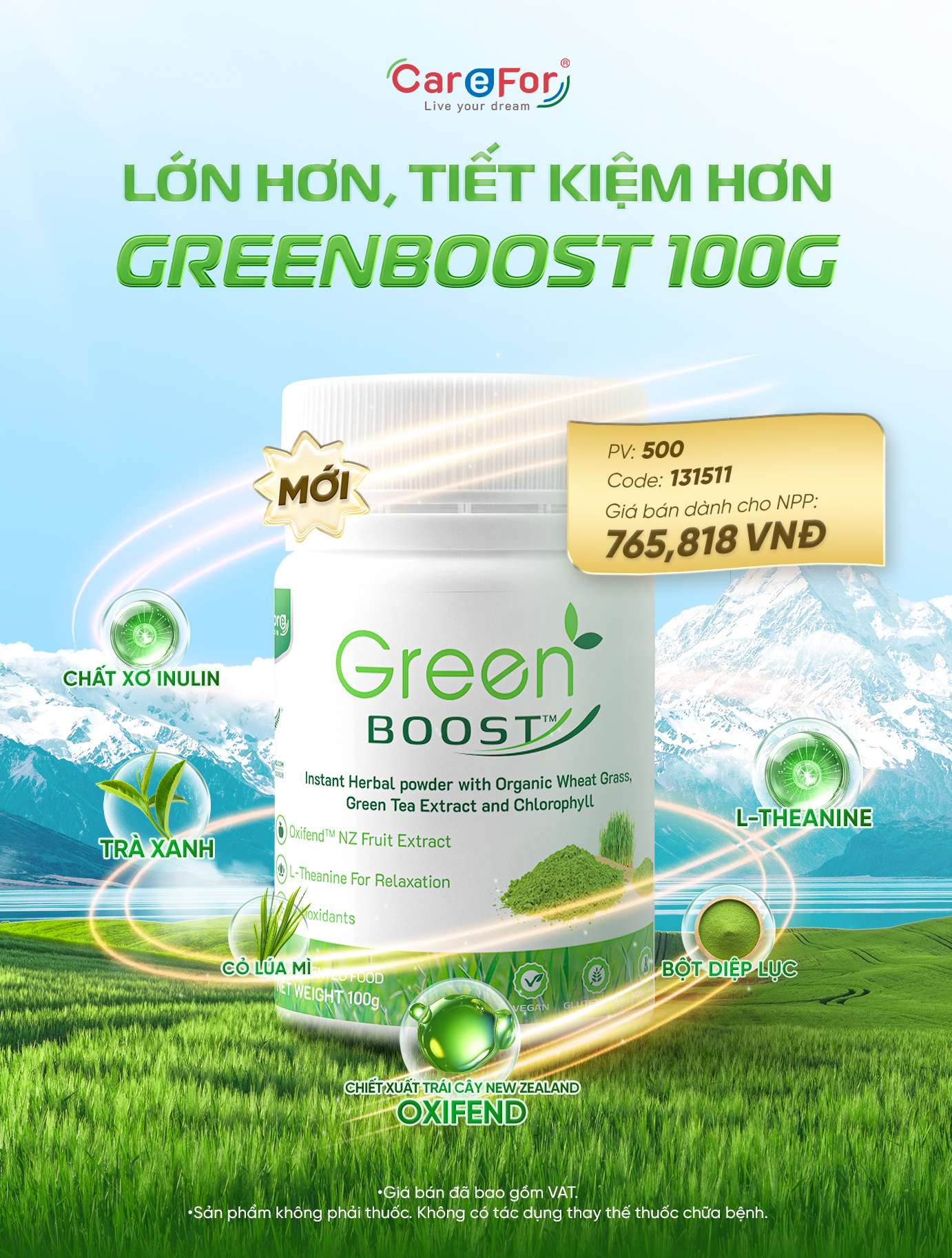 Nếu Trà Diệp Lục Thảo Mộc GreenBoost 60g đã từng đem đến sự nhẹ nhàng, thư thái và phong cách "sống xanh" từ New Zealand thì nay, phiên bản GreenBoost 100g sẽ đem đến nhiều lợi ích hơn nữa.